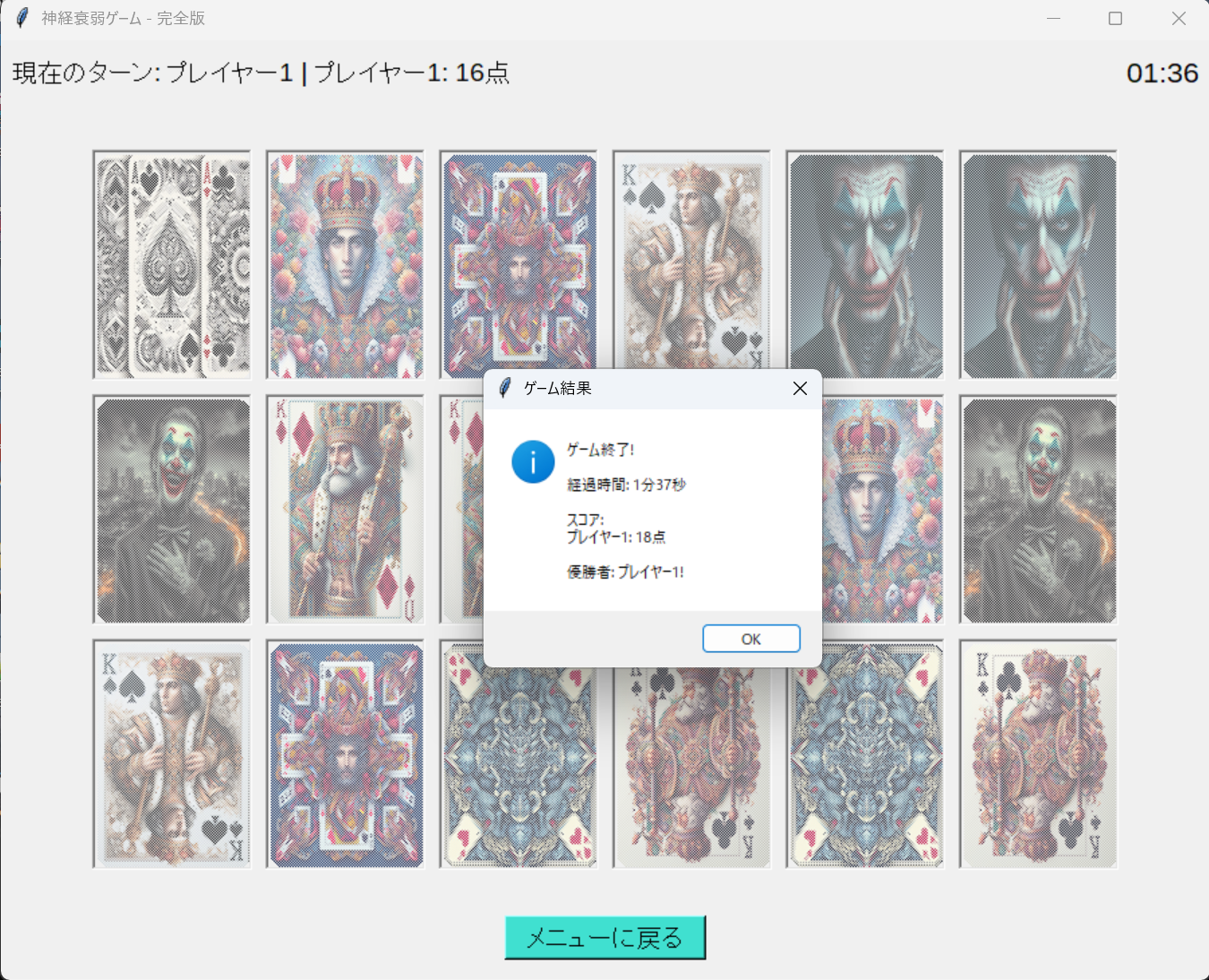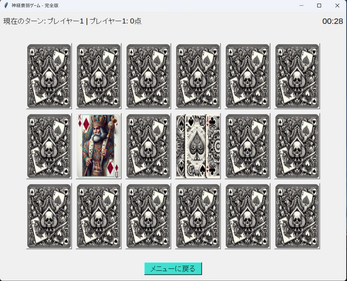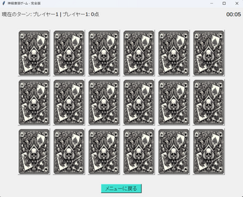 - ゲームクリア: すべてのカードのペアを見つけるとゲーム終了です。クリアまでにかかった時間やターン数が表示され、自分の記録として残ります。