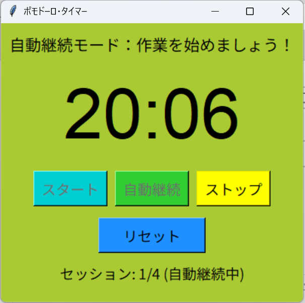 - 「自動継続」による流れの形成: この機能が使用感の鍵を握ります。一度「スタート」と「自動継続」を押せば、あとはタイマーが25分の作業と5分の休憩を延々と繰り返してくれます。ユーザーはタイマーの操作を一切気にすることなく、純粋に「今は集中モードか休憩モードか」だけに意識を向けることができ、理想的な作業リズムが自然と身に付きます。